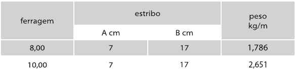 espaçamentos entre estribos de 20cm. Fornecido em peças de 3; 3,5; 4; 4,5; 5; 6; 7 e 8m.